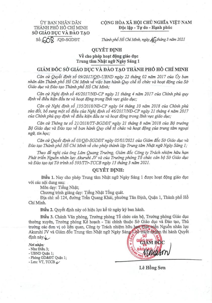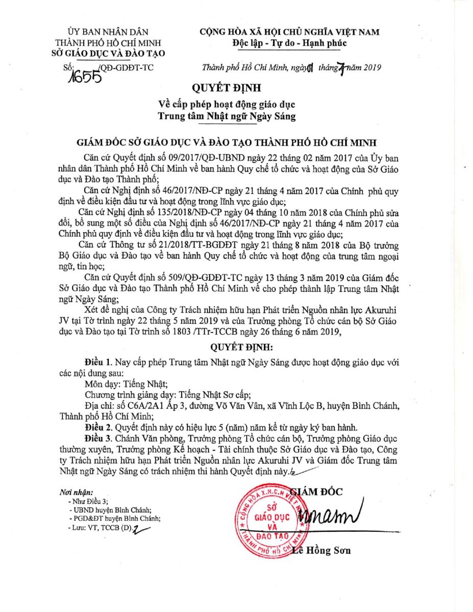 Giấy phép hoạt động Trung tâm Nhật ngữ Ngày Sáng
